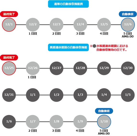 なお、ゴールデンウィーク・お盆・年末年始の長期連休におきましては、弊社が定める自動検収機能無効期間は上記の5日にカウントされなくなりますので、ご注意ください。
